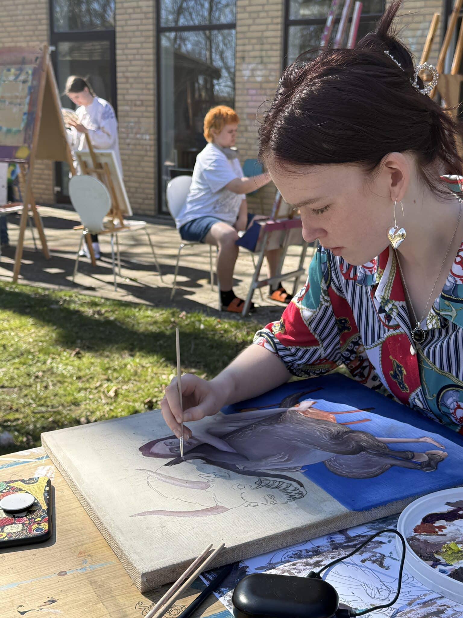 Atelieret har, hvad den kunstneriske proces kræver af farver, pensler, staffelier m.m.